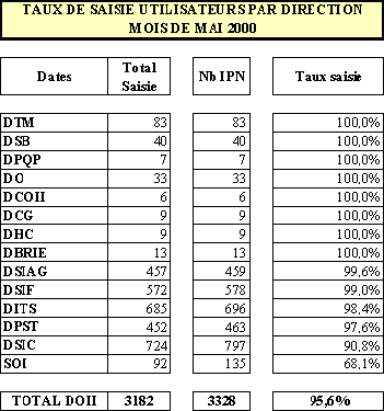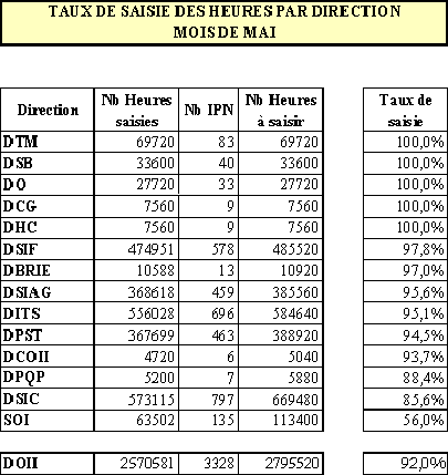 Le taux de saisie escompté pour un démarrage est largement dépassé; le bilan de fin mai affiche plus de 95% des heures saisies pour le mois de mai et la reprise du 1er quadrimestre. Le soulagement fait suite à l'appréhension, à l'heure où ce bilan peut fièrement être annoncé. La DOII a su tirer parti des précédentes expériences des déploiements à l'Ingénierie Véhicule et à la Direction de la Mécanique. Ajoutez à cela un suivi rapproché et le résultat a été atteint. La DOII a montré qu'elle sait se mobiliser.